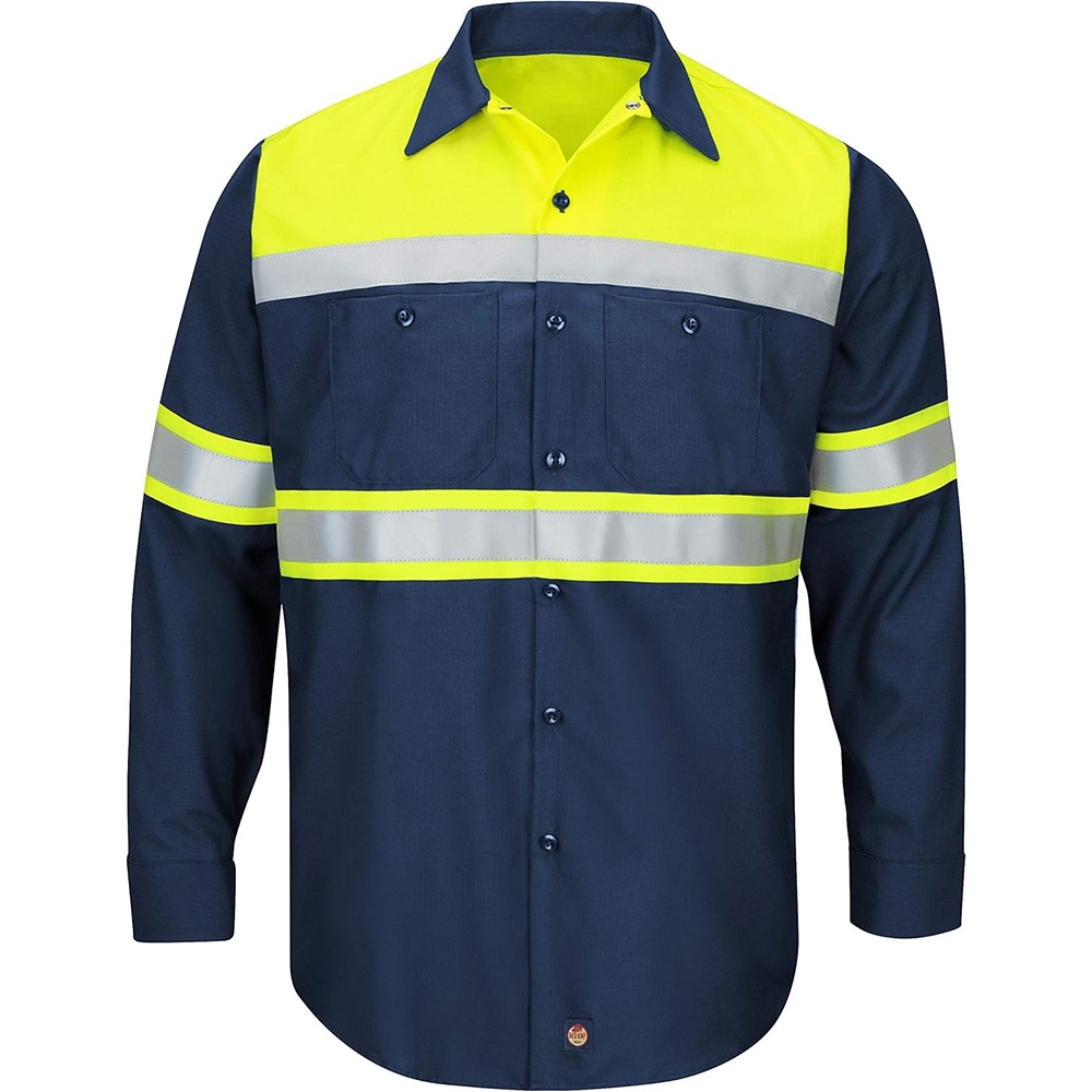 Designed for workers in high-risk environments—electrical utilities, oil and gas, welding, and heavy industrial construction—this shirt meets stringent safety standards while delivering all-day comfort and professional appearance. The distinctive fluorescent yellow and navy blue two-tone design enhances visibility while the navy lower panel effectively conceals dirt and stains common in demanding work environments.