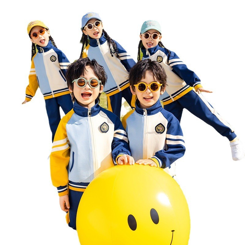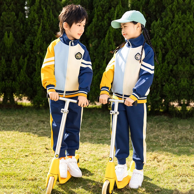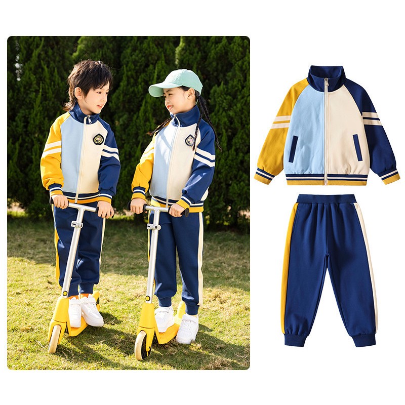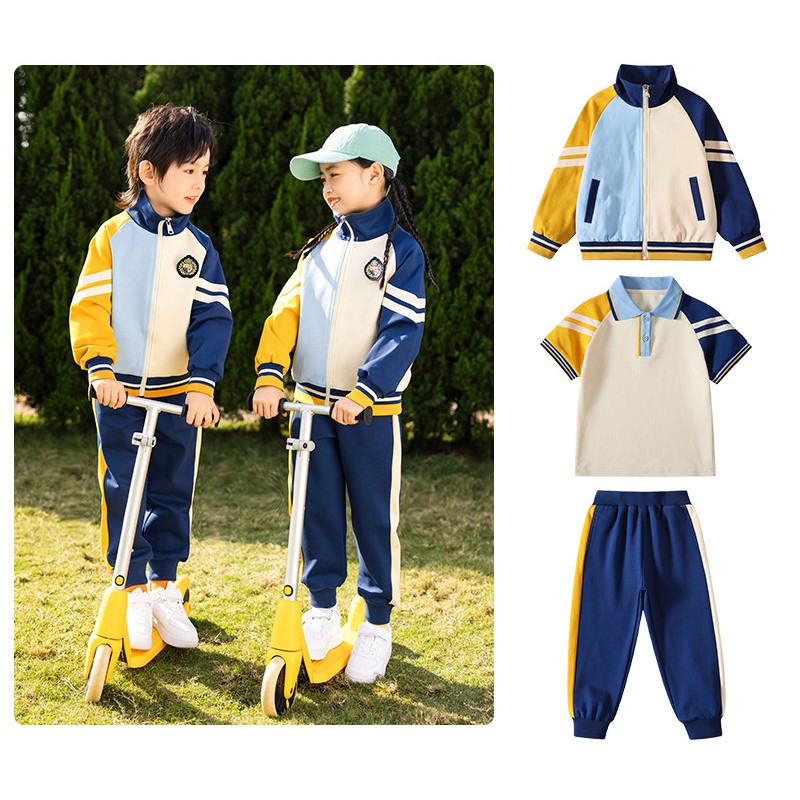 Mfumo huu wa sare mzuri unaangazia rangi mchanganyiko wa rangi ya bluu, manjano na nyeupe ambayo huunda maelewano ya kuona katika vipande vyote. Mkusanyiko hutoa suluhisho za vitendo kwa misimu tofauti wakati unadumisha urembo wa riadha ulioungana kwa maisha ya shule ya kazi.