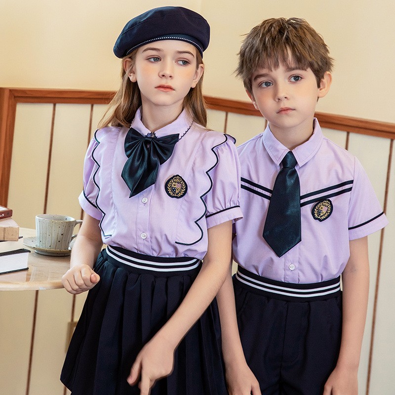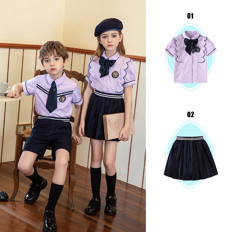 Mkusanyiko huu wa sare nzuri una mchanganyiko wa lavender na majini, kujumuisha vitu vya kitamaduni na mtindo unaofaa na watoto. Maelezo yaliyosafishwa huunda urembo rasmi lakini wa kijana unaofaa kwa hafla anuwai za shule.