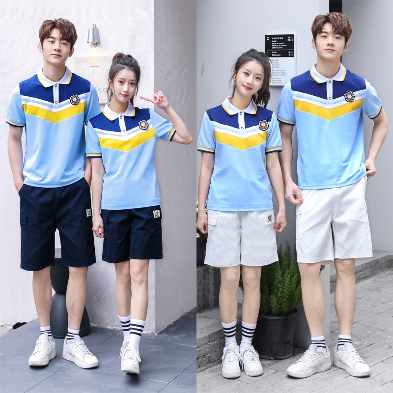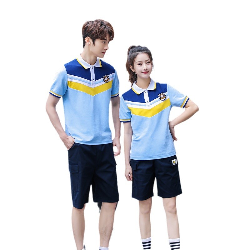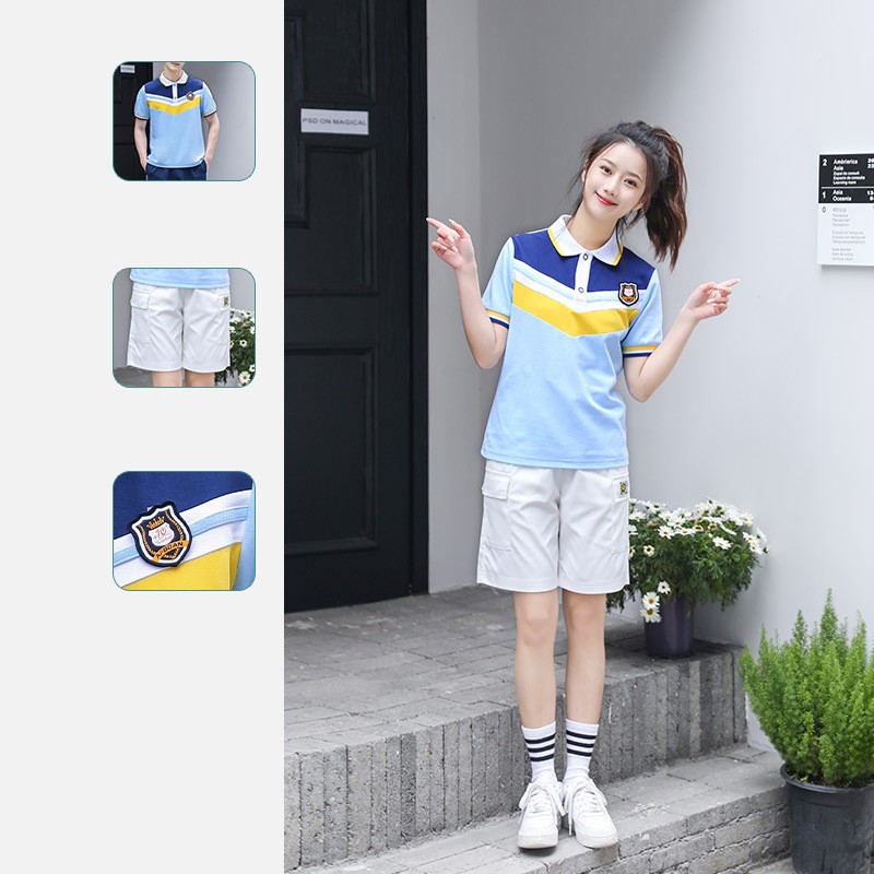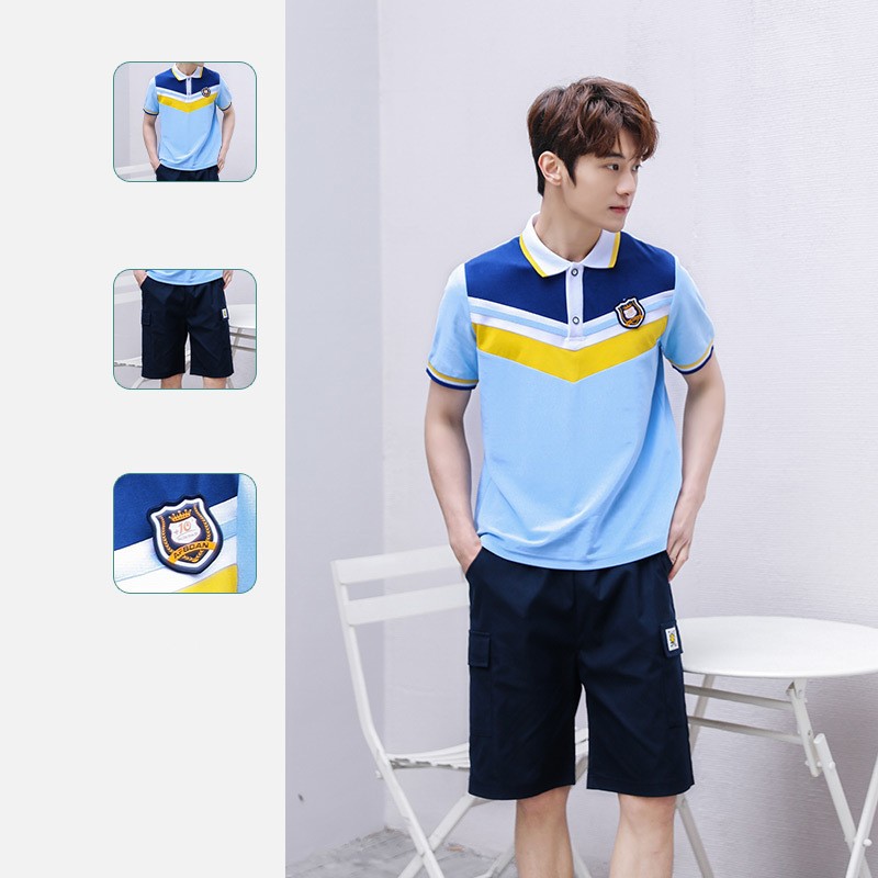 Seti hii ya vipande viwili yenye nguvu imeundwa kuweka wanafunzi baridi, raha, na kuonekana kali wakati wa miezi ya joto ya kitaaluma. Rangi ya samawati na manjano ya umbo la V inayozuia kwenye shati la polo huunda kitambulisho cha kisasa, chenye nguvu, wakati uchaguzi wa rangi mbili fupi hutoa kubadilika kulingana na mtindo wowote wa shule.