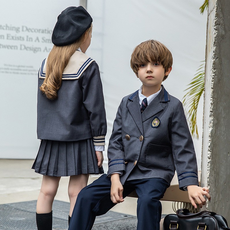 Seti hii ya sare iliyoundwa kwa njia isiyo ya kawaida huleta mapokeo ya mtindo wa masomo ya Uingereza kwenye shule yako. Iliyo na muundo ulioratibiwa kwa wavulana na wasichana wenye kisasa cha kijivu cha makaa na mpango wa rangi ya bluu ya majini, inachochea hisi ya nidhamu, kiburi, na jamii miongoni mwa wanafunzi.